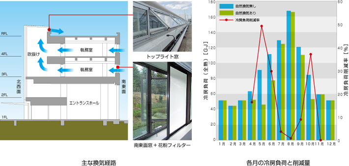 低層事務所建物である当社技術センターにおいて,リニューアル工事に伴い,自然換気を積極的に利用するため,自然換気可能な窓を外壁面及び吹抜け上部に設けました。これら開口から,積極的に外気を導入することで,建物の快適性,省エネルギー性の向上を図りました。