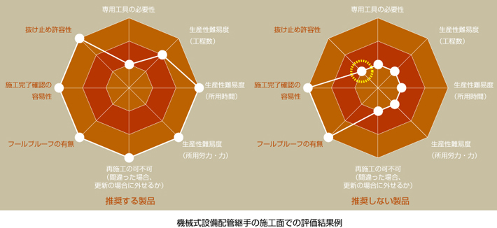 集合住宅等で給水・給湯配管に使用されるメカニカル継手をSUS管及び樹脂管別に分類し,それぞれの仕様・規格及び施工面での特徴を判り易く整理し一覧表にまとめました。また,各継手毎に施工性を評価項目毎に採点しレーダーチャート化し評価を行ないました。継手の選定時には,この一覧表をもとに現場毎の使用用途に適合している事と注意点の確認を行なえます。この一覧表とメカニカル継手の評価の考え方をまとめて,施工の手引きとして社内に展開し,施工時の継手選定・施工管理に役立てます。