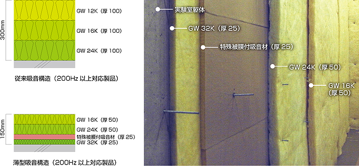 吸音材の厚さを抑制するために,膜振動を利用した低周波吸音材を用い,さらに,広帯域で高い吸音率を確保するために,その上に吸音材を積層する構造を採用しました。低周波吸音材の上に積層されたグラスウールは,中・高音域の吸音だけでなく低周波吸音材の吸音のピーク周波数をより低い周波数にシフトさせる効果があり,従来の吸音構造の半分の厚さで同等の吸音性能を得ることができます。