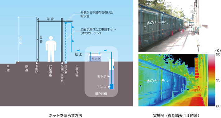 仮囲いの現場側に工事用ネットを張り,ネット最上部から地盤掘削工事で発生した地下水を再利用して流します。水はネットを伝って流れ落ち,気化熱で周囲の気温を下げます。その結果,ヒートアイランド対策や熱中症対策として,仮囲い周辺にクールスポットを創出します。(特許出願済み)