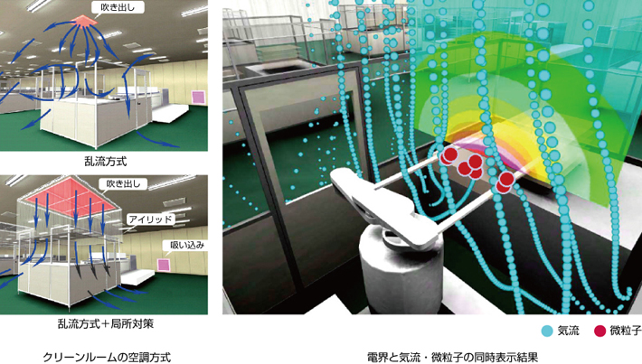 クリーンルームの建設では,設計の段階から製品品質に直接影響する生産装置内外の気流・発生した微粒子の挙動・静電気などの変動要因を正確に予測し,これらの変動要因を的確に制御する構造物・生産装置の計画が必要です。気流分布などの環境物理要素を正確に予測するには空間の形状設定・メッシュ生成などの準備に多大な労力を有するため,解析対象となる空間形状が決定されない計画初期段階では,解析結果を提示することが従来困難でした。これらを解決するために,計画変更と気流解析を連動させた機能および計画案と気流・温熱・微粒子挙動・静電気等の数値解析結果を融合して表示できる機能を有するシミュレーションシステムを開発しました。