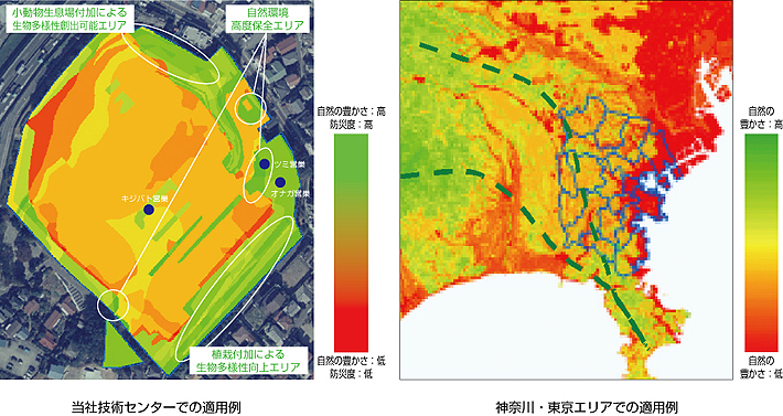 本研究を当社技術センター(左上図)および神奈川・東京エリア(右上図)に適用し評価しました。当社技術センターの評価では,自然が豊かであるエリアを明示できました。神奈川・東京エリアの評価では,図中の破線が示すように,生態系にとって非常に重要なコリドー(野生生物の移動に配慮した連続性のあるネットワーク)を確認できました。結果は,保全すべきエリアに留意した工事用道路,資材ヤード等の配置計画や施工中の自然環境の保全度合いを把握するツールとして活用できます。今後は,建設工事現場のような局所的な範囲において,対象地特有の自然環境を考慮した自然度や対象地に生息する小動物のHSIモデルを評価していく予定です。