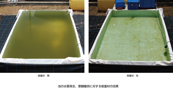 適切な吸着材の選択と利用により,模擬池に流入する窒素,リンを効率的に低減することができました。これにより,池の水質汚濁による景観悪化や異臭の発生を大幅に低減でき,模擬池における藻類の増殖を抑制できることがわかりました。本技術を用いることで,生態系に配慮した,低コストで安定した水質保全を図ることが可能となります。