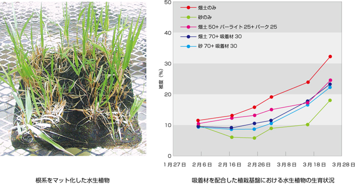 前報(その1)で選定された機能性木炭とリン吸着材を含む植栽基盤で水生植物を育成したところ,何も含まない砂基盤に比べて水生植物が旺盛に生育したことから,吸着材に吸着された窒素やリンを水生植物は利用できることが明らかとなりました。また,砂基盤に対して吸着材を30%ほど含む植栽基盤において水生植物を育成することにより,根系を平板化できることが明らかとなりました。