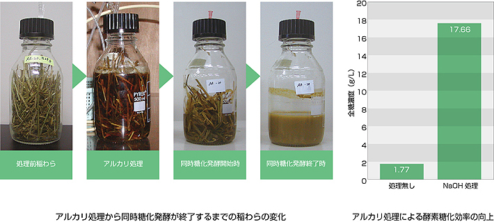 稲わらに代表される単子葉植物は、アルカリ浸漬の前処理を施すことにより、酵素糖化効率が大幅に向上します。アルカリ処理は常温常圧の反応なので、ボールミル粉砕、熱水処理、希硫酸処理といった既存技術と比較して、省エネルギーかつ低コスト、かつ運転管理が容易です。セルロースの結晶構造について、アルカリ処理とボールミル粉砕との比較を行い、またアルカリによって溶出する物質の分析を行い、アルカリ処理が稲わらの酵素糖化効率を向上させるメカニズムについて解明しました。