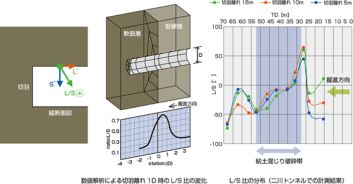 ここでは,上で挙げた方法の内の一つ(1)を説明します。上図左はSchubertとBudilによる三次元解析結果ですが,トンネルを堅硬な岩盤から軟弱な層に向けて掘削した場合,計測される天端沈下とトンネル軸方向変位の比L/Sを図のような符号の定義にてトンネルの距離程に沿ってプロットすると,図のように,層境の手前から正への値の変化が現れることが分かります。この原理により,坑内変位計測結果から切羽前方の地山の変化を推定することができます。
