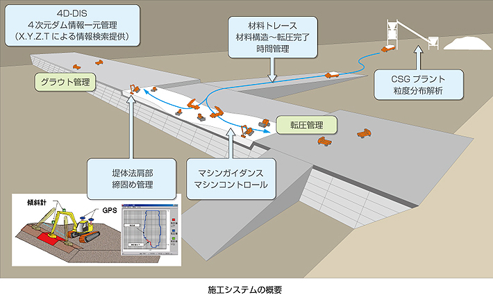 本開発の中心は,4D-DIS(4 Dimensions - Dam Information Service)により,施工ヤードの座標と時刻(X,Y,Z,T)により施工情報を統合化し,必要情報の高速検索・出力・情報共有を可能にすることです。また,近年注目されている台形CSGダムに対しては,CSG締固め時間管理システム(材料トレース),法肩転圧管理システム,CSG材料粒度分布解析システムにより高品質な施工管理を実現できます。