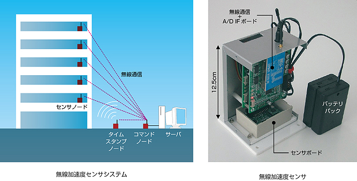 構造物の多点同時振動計測をする場合,煩雑なケーブルの配線作業は多くの労力を要します。この作業をなくし,効率的な計測を実現するのが無線加速度センサシステムです。加速度センサおよび無線モジュールを搭載したセンサノードを測点に設置するだけで,多点同時振動計測をワイヤレスで行うことが可能です。加速度センサには,小型・安価なMEMS加速度センサを採用し,また測点間の時刻同期を高精度に確保する工夫をしました。