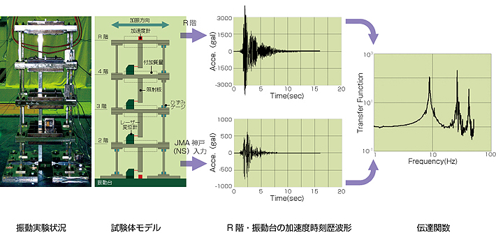 本技術は,外乱を受けた構造物の健全性を確認するため,新たなアルゴリズムからできるだけ少数の加速度センサーを用いて建物全体の特性把握および損傷層を特定する評価技術です。今回の実験では,4層の鉄骨模型試験体を製作し,相似則を適用して,ホワイトノイズや実地震動を建物の基礎に入力した時の入力値と最上階の加速度応答値から振動数の変化と伝達関数を検討しました。
