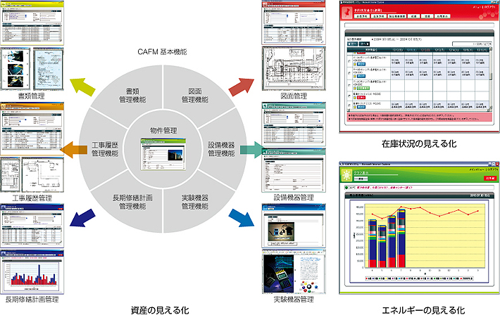 研究所CAFMシステムは,①施設に関する図面,書類等の管理機能(基本機能)②RFID利用による設備・実験機器の現状把握機能(プレゼンス機能)で構成され,従来のCAFMに無い様々なサービスを提供することができます。また,施設で消費されている電気,ガス,水道,灯油等のエネルギーの使用状況も「見える化」しました。これら「見える化」されたデータは,適正な施設管理や長期修繕計画の策定,省エネルギー対策の実施に活かすことができます。