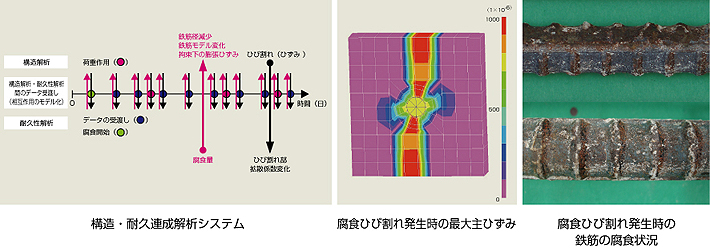 構造・耐久連成解析システムにおいて入力パラメータである腐食生成物の膨張率を1.1〜2.0と設定することで概ねひび割れ発生限界腐食量を測定した既往の実験結果を再現できることを示しました。本システムにより,腐食ひび割れ発生時期の予測精度が向上します。