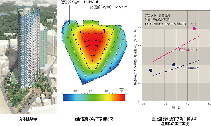 直接基礎は,建築物に作用する荷重を基礎スラブを介して地盤に直接伝える基礎形式です。支持層が地中浅い場合に適しており,地中深くまで杭を打設する杭基礎に比べて,コスト,工期などが少なくて済みます。いずれの基礎形式を採用する場合も,所定の支持力を確保させ,かつ沈下が許容値以下となるように設計することが大切になります。今回,基礎面積あたりの重量が0.8MN/m2にもなる地上43階建ての超高層集合住宅(鉄筋コンクリート造)を支持する直接基礎の沈下予測を行い,その検証と基礎構造の品質確認のための沈下計測を行いました。