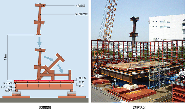 鉄道の線路上空に建物を建設する場合,その作業は列車の運行が終了した深夜の僅かな時間に限られており,建物が完成するまでに長い年月がかかっていました。この問題点を解決するため,線路上空に防護対策を施した人工地盤(二重構造の床)を設置して,鉄骨建方などの工事を昼間に行うことで工期の短縮が図れます。この人工地盤上に吊り荷が落下した場合においても,線路やホームの安全性が確保できることを確認するため,実大試験体を用いた鉄骨落下衝撃試験を実施しました。