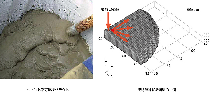 セメント系可塑状グラウトは,自立する硬さを有しながらも容易に圧入することができる材料で,構造物基礎周りや地盤中の空洞充填に適した材料です。従来から用いられたトンネルの裏込め材以外に,近年では当社のボスポラス海峡横断鉄道における沈埋トンネル基礎に用いられ,また,今後の維持・補修関連工事での利用が見込まれています。充填時にかける圧力が及ぼす周辺構造物・地盤への影響に対して,これまでは経験的,実験的観点でグラウト硬さや充填速度等を調整して対処してきました。本検討は,新たに数値解析による検討手法を構築し,施工性の評価に役立てようとするものです。