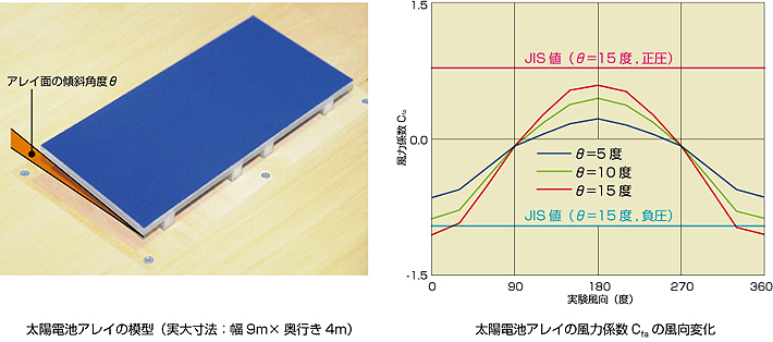 近年,地球温暖化の原因である温室効果ガスの排出削減対策として,太陽光発電の導入が期待されています。太陽電池は太陽電池セル(10〜15cm角程度)が最小単位となり,セルを数十枚程度接続したものを太陽電池モジュール(1m角程度)と呼び,モジュールを接続して大型パネル化したものを太陽電池アレイと呼びます。この太陽電池アレイに作用する風力係数の近似式が与えられているJIS C 8955では,アレイ面の傾斜角度θが15度未満の太陽電池アレイを対象外としています。しかし,東京や大阪等において太陽電池の発電量がほぼ最大となるθ=30度のアレイを配置するよりも,θ=5度のアレイを配置する方が,同じ敷地面積では約1.8倍の発電量を得る事が可能です(アレイの設置数は約2倍,発電量は約0.9倍)。また,θを小さくするとアレイに作用する風荷重の緩和が推測されます。そこで,θが15度以下のアレイに作用する風力特性の把握を目的として風圧実験を行いました。