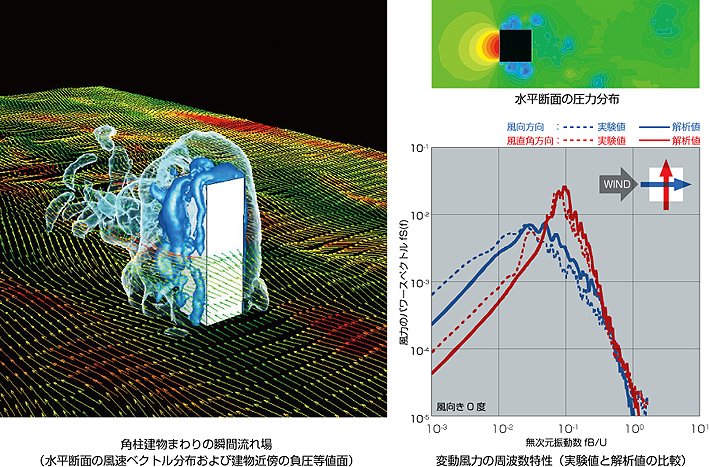 建物全体に作用する風力,壁面に局所的に作用する風圧力それぞれについて,解析結果は概ね良い精度で実験値と対応することを確認しました。しかしながら,風圧力の変動成分については局所的に改善の余地があり,更なる精度向上と解析技術の実用化に向けた検討を進めてゆく予定です。