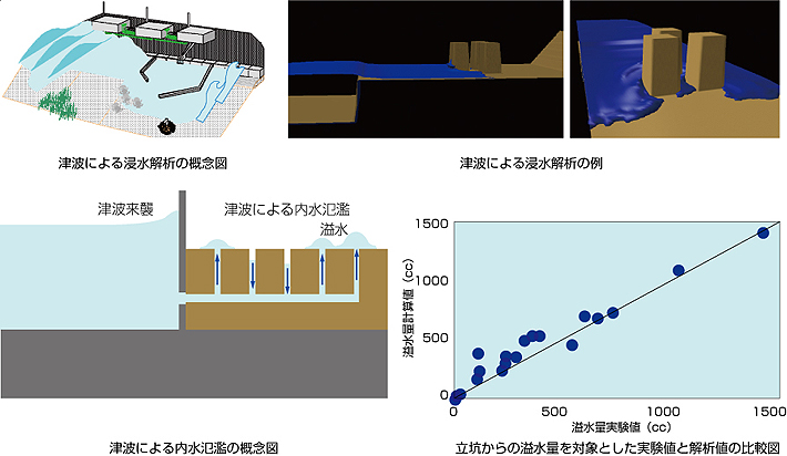 岸壁を越流して陸域に遡上する遡上解析は,ポーラスモデルを用いて拡張した3次元非圧縮性粘性流体を対象とした連続式およびNavier-Stokes方程式を基礎式とし,VOF法により自由表面を解析する手法です。その適用性を水理模型実験結果と比較することで検討しました。内水氾濫については,水理模型実験により溢水を伴わないサージング現象と溢水現象の相違点を明確にした上で,溢水を考慮できるよう運動量収支に基づいた一次元管路モデルを導出し,水理模型実験結果と比較することでモデルの検証を定量的に行ないました。