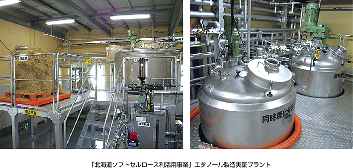 化石資源由来のCO2排出量削減を目的に,化石燃料の代替燃料として利用されるバイオエタノールは,その原料を食糧穀物から食糧と競合しないセルロース系バイオマスへとシフトする動きにあります。日本国内でその腑存量が多いソフトセルロース系バイオマスである,稲わらからバイオエタノールを製造する実証プラントを農林水産省「ソフトセルロース利活用技術確立事業」にて建設し,将来の大規模エタノール生産技術確立を目的に,エタノール生産の低コスト化,高効率生産を目指した実証実験を行っています。