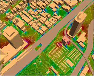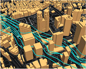 - 三次元地図情報を用い、短時間でコンピュータ上に市街地を構築できます。
