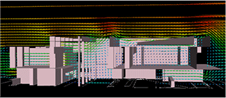市街地の風環境や建物内部の風の流れを解析し、ビジュアルに表現する技術です。