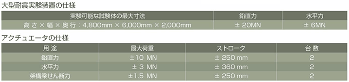 鉛直方向には荷重±20MN、ストローク±250mmまで、水平方向には荷重±6MN、ストローク±360mmまでの大容量・大変形の載荷が可能です。