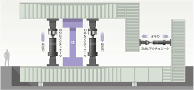大型耐震装置は、大容量の油圧サーボアクチュエータシステムと加力梁、基礎梁および面外拘束用の鉄骨部材によって構成されています。