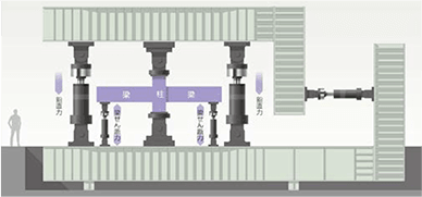 柱の実験では、2台の10MNアクチュエータによってL形梁間の平行保持と±20MNの軸力の載荷を行い、2台の3MNアクチュエータによって±6MNの水平力が載荷できます。柱梁架構の実験では、柱に±10MNの軸力を作用させた状態で、梁に±1.5MNのせん断力を載荷し、地震時の柱梁架構の応力状態を再現できます。