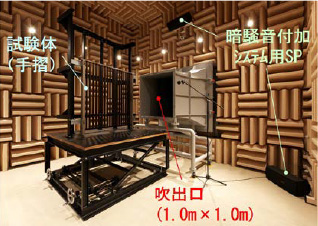 実際の建物周辺に存在する道路交通騒音や鉄道騒音などの暗騒音を、場所や音量別で再現することができる暗騒音付加システムを業界で初めて音響風洞実験室内に導入しました。