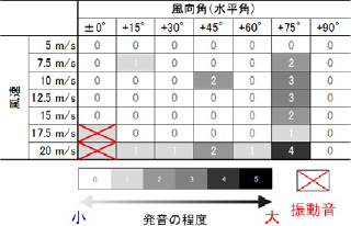 音響風洞実験室で計測された風騒音特性(周波数スペクトル分析結果)と暗騒音との関係から、対象部材に作用する風向・風速条件別に、風騒音発生の有無や発音の程度を客観的に評価することが可能となる風騒音評価システムを導入しました。