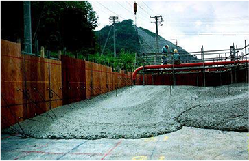 大規模マスコンクリート構造物の大量一括施工と急速施工が可能な高流動コンクリートです。