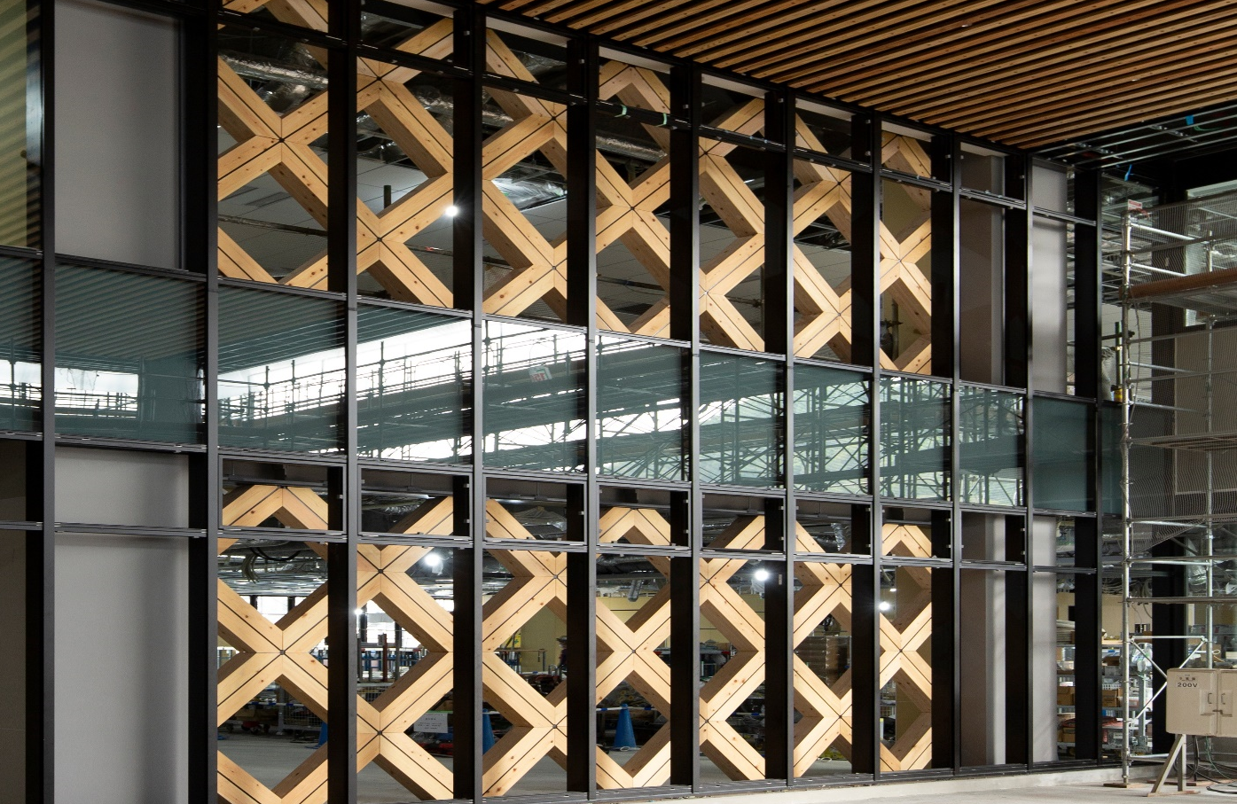 この位置には当初、一般的な鉄骨ブレースを設置する計画でしたが、デザイン性の重視や木材の利用促進の観点からT-WOOD BRACEへ変更しました。利用者の目に触れる機会の多い正面玄関に、木材を用いた意匠性の高い耐震構面を配置することにより、安全・安心とともに親しみや温もりを感じられる建物を目指しました。