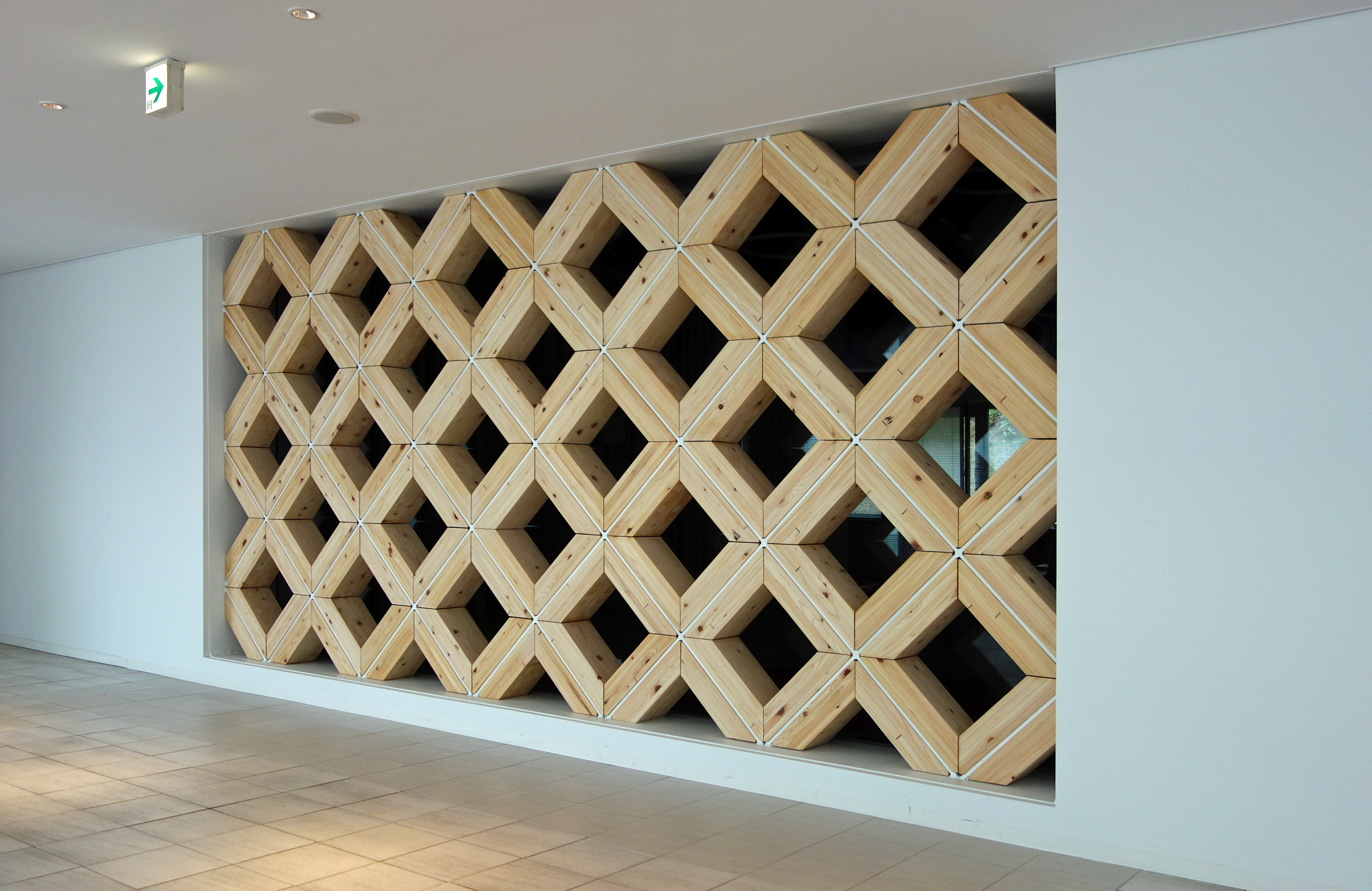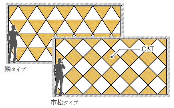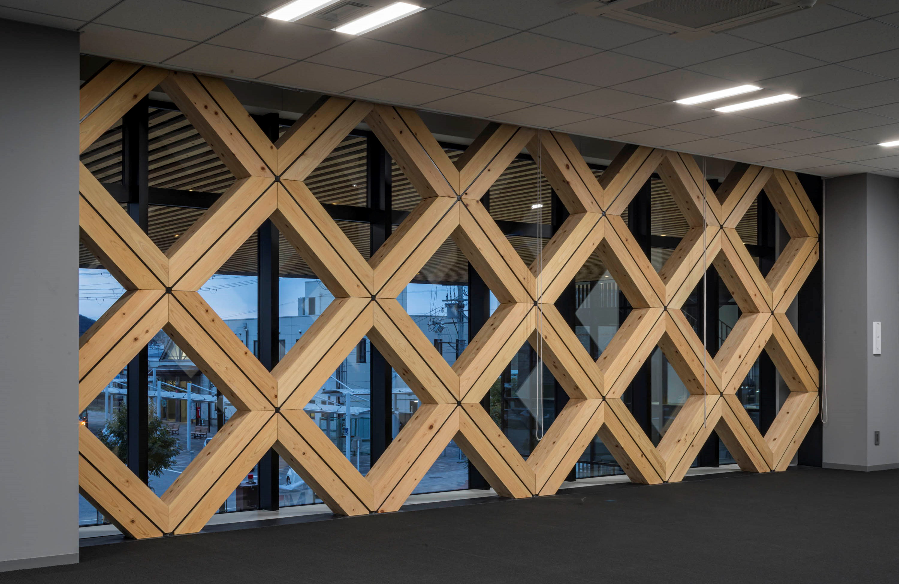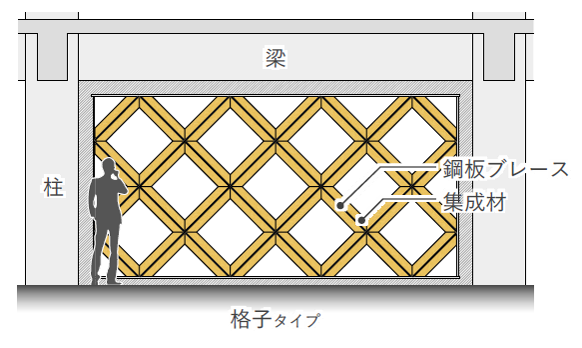 鋼板を斜め格子状に組んだブレースの枠内に、集成材・直交集成板(CLT)などの木材を配置した耐震構法です。斜め格子の角度・間隔と木質系材料の形状・配置との組み合わせにより、様々なデザインの構面が可能です。