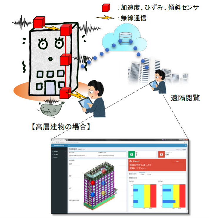 構造ヘルスモニタリング「T-iAlert® Structure」は、建物内にセンサを設置し、常時および非常時の観測データから即時に建物の健全性を評価するシステムです。