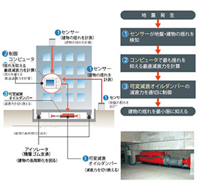 - 建物の揺れをセンサーで検知、揺れに応じて最適な減衰力をコンピュータで判断し、中小地震から大地震に至るまで、建物の揺れを最小限に抑えます。